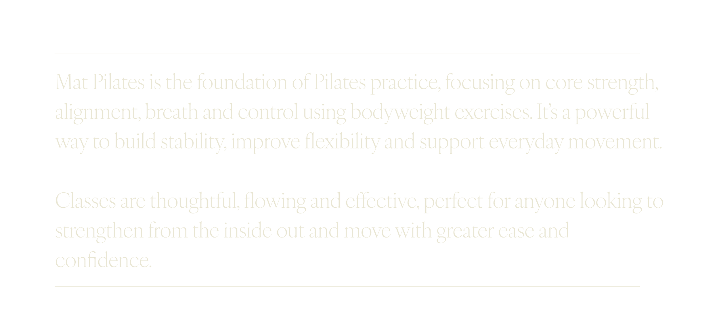 A welcoming all-level class using classic Pilates mat work to strengthen, lengthen, and align. Options to modify or progress so everyone feels challenged.